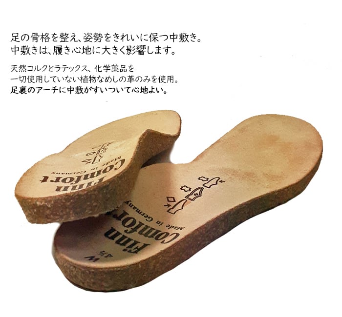 ●フィンコンフォートのインソール(中敷き)は、天然コルクとラテックス、 化学薬品を一切使用していない植物なめしの革のみを使用。足のための最高の環境を作り出しています。